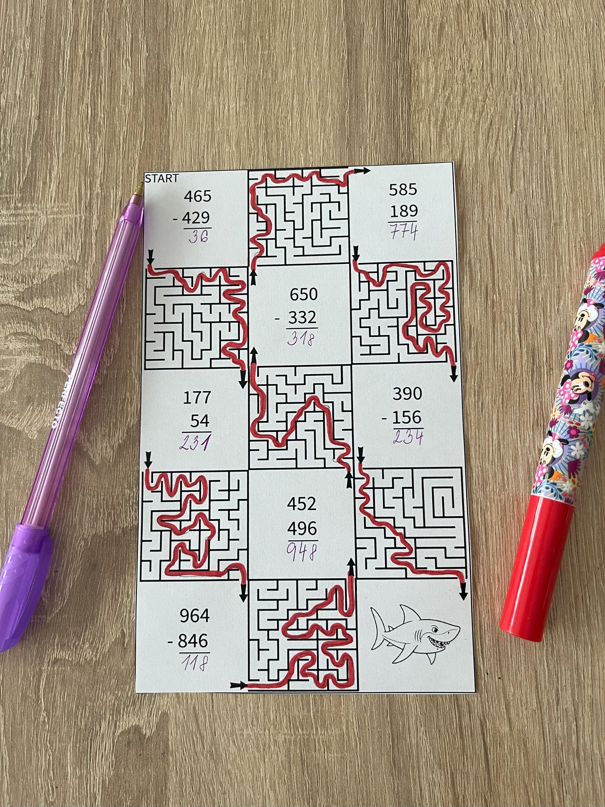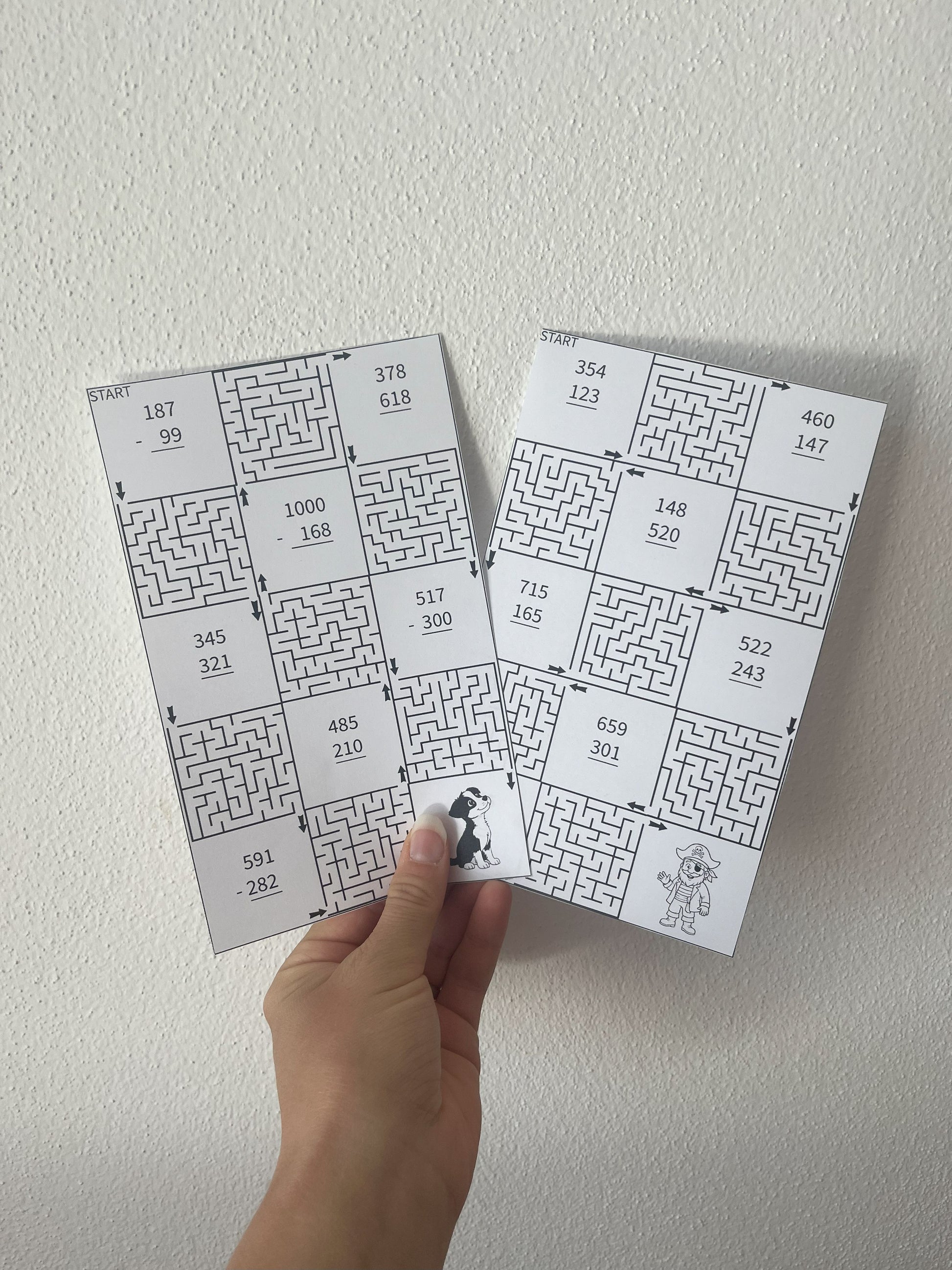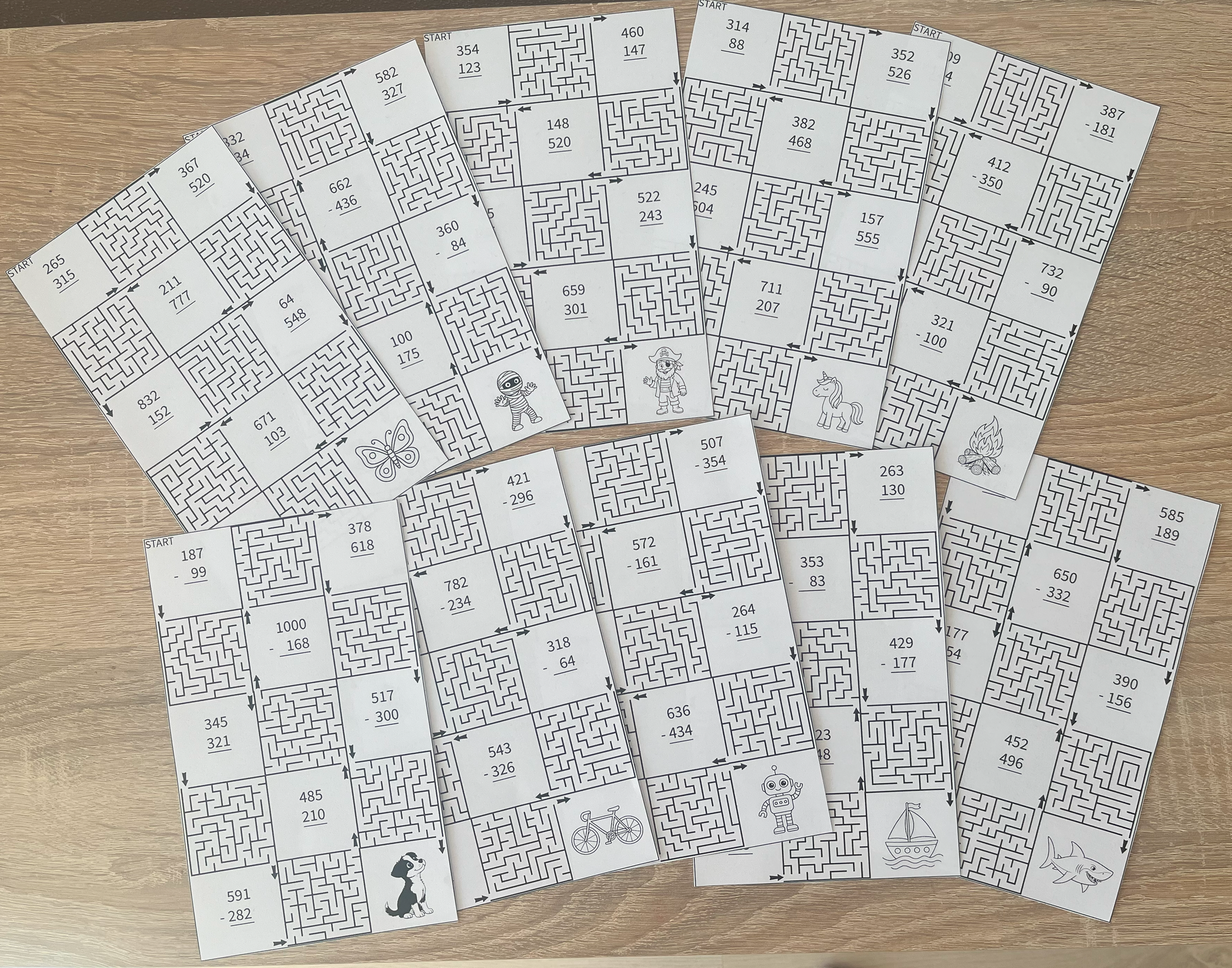 Tento soubor obsahuje 10 karet, které spojují počítání a zábavu v jednom. Žáci si procvičí písemné sčítání a odčítání do 1000 a zároveň si odpočinou při luštění bludišť. Úkolem je postupovat podle šipek, počítat příklady a hledat cesty skrze bludiště, která pomáhají