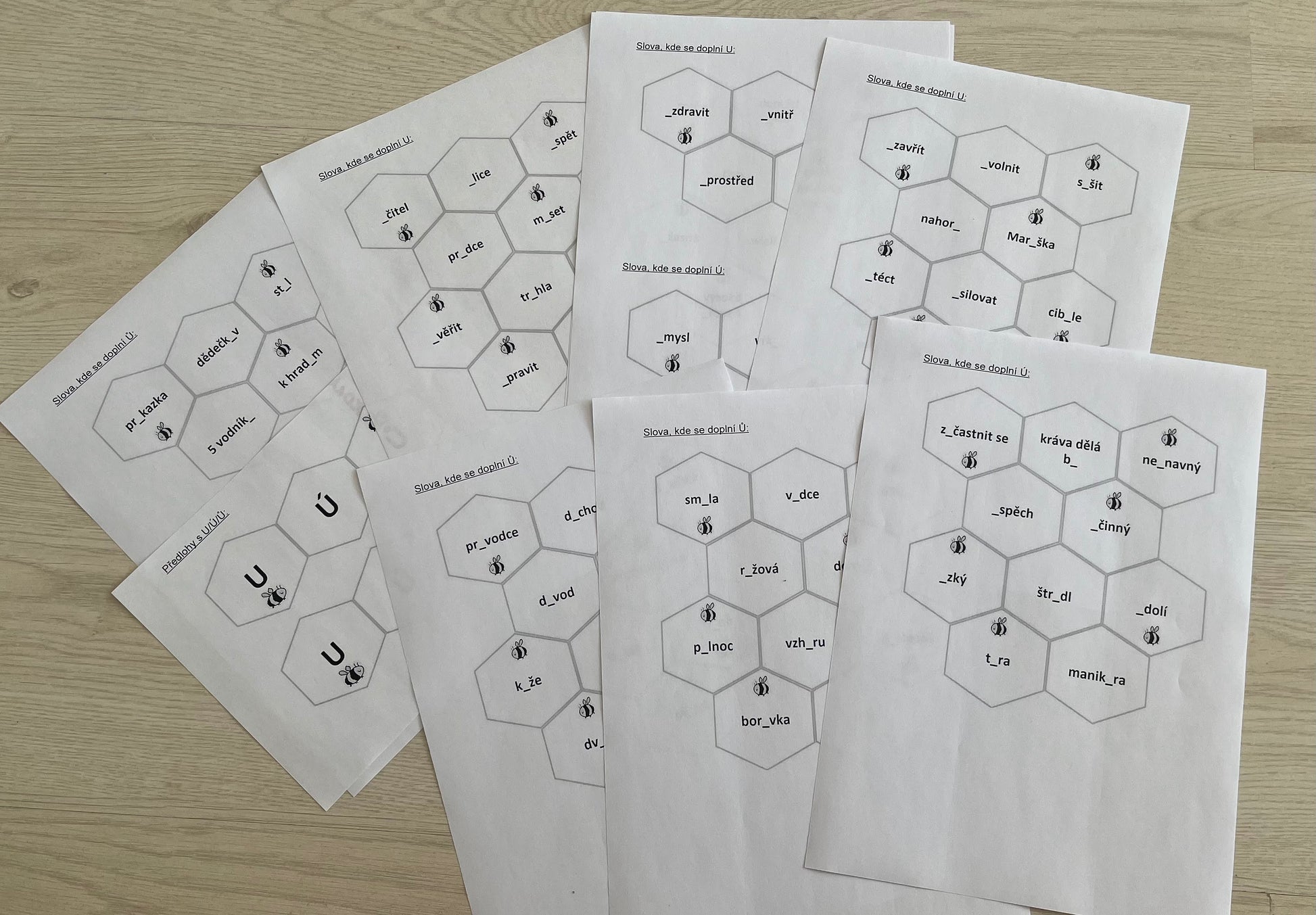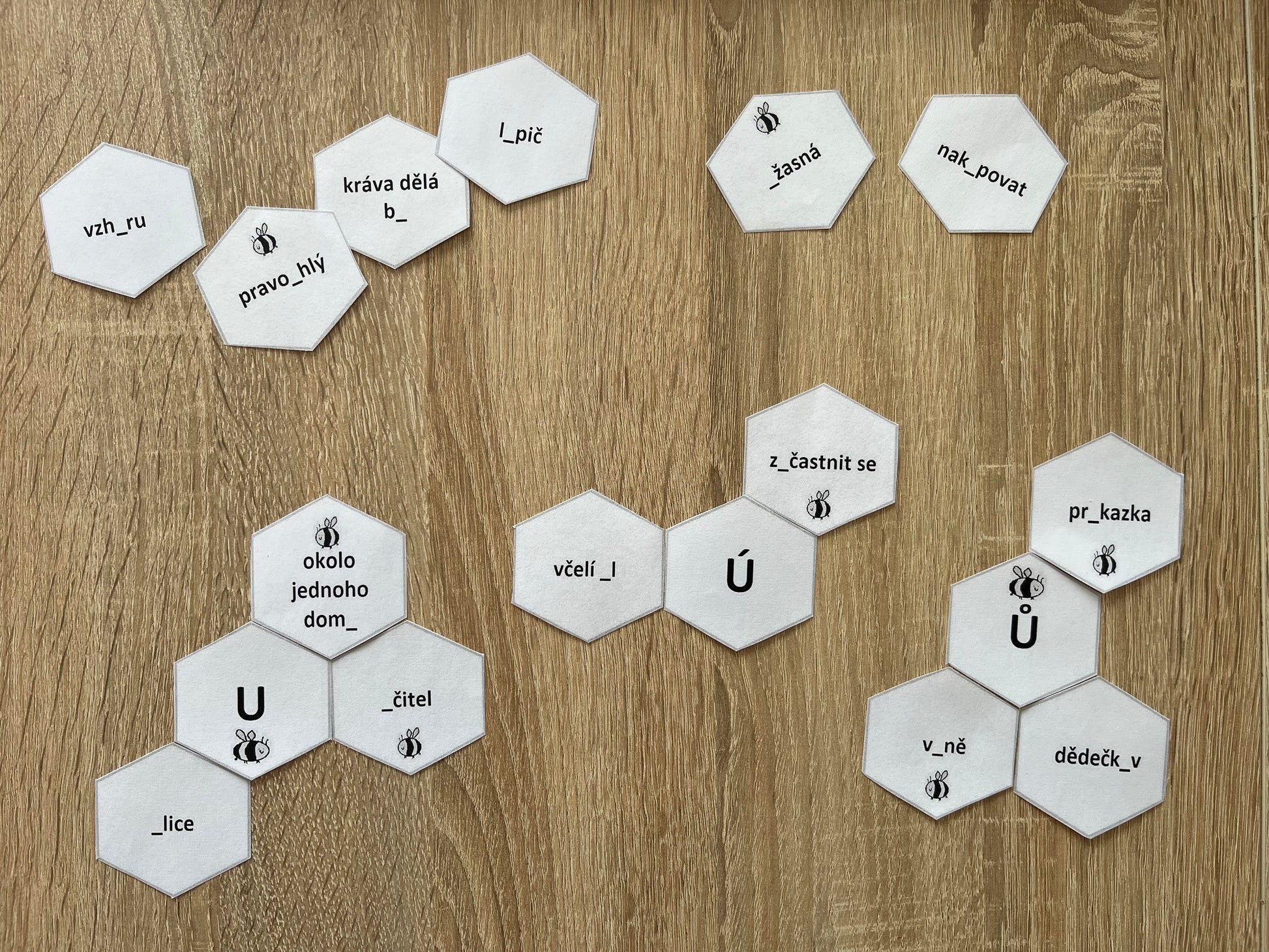 - 6 šestiúhelníků s u/ú/ů (2x U, 2x Ú, 2x Ů)